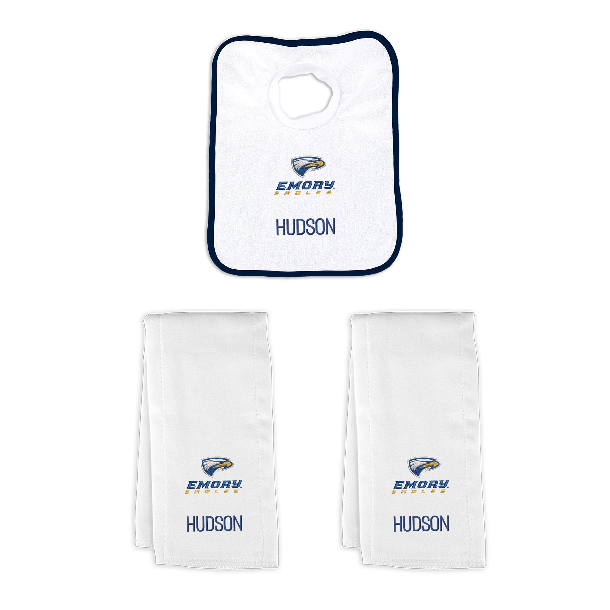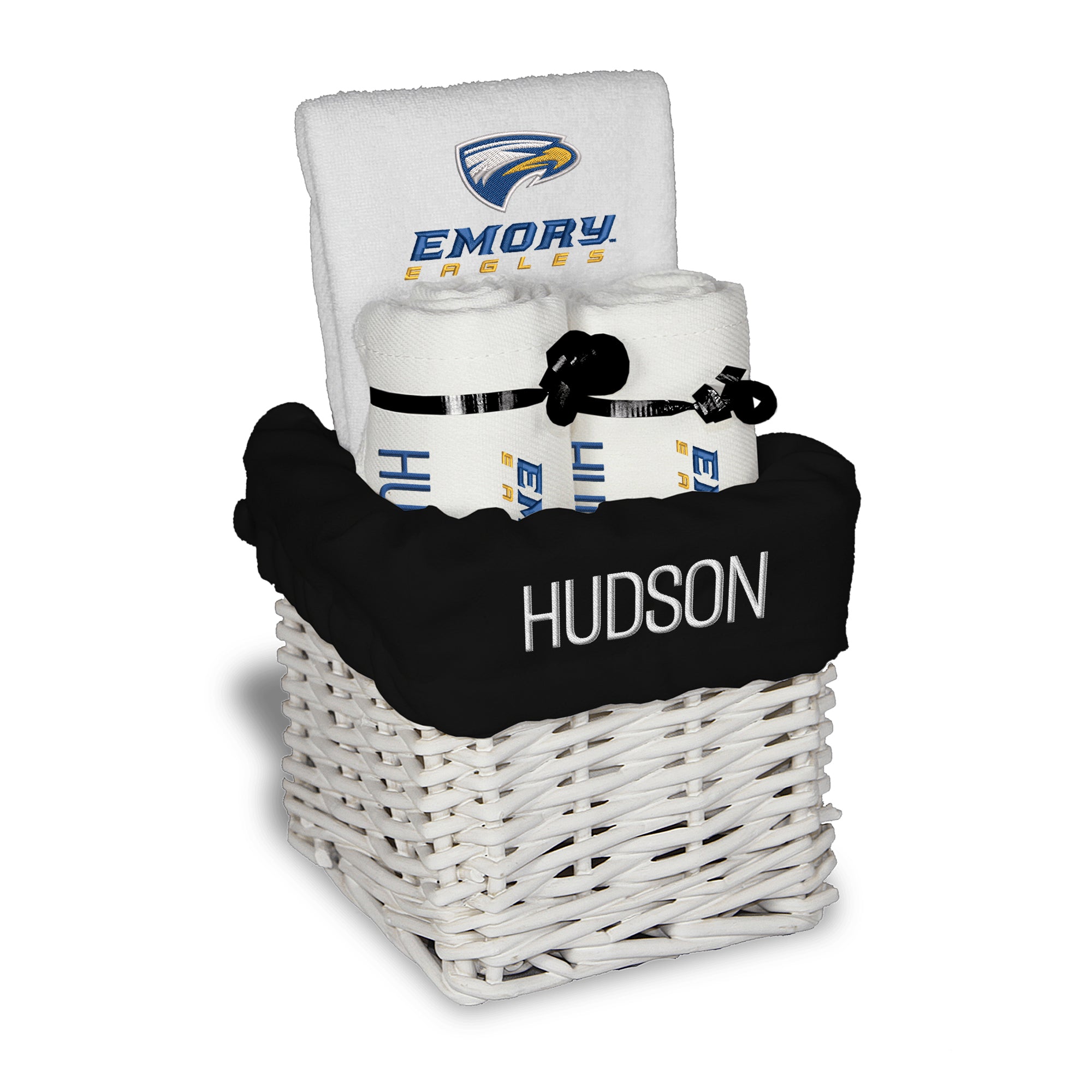 Our Personalized Emory Eagles Small Gift Basket contains 3 of our best-selling items packaged in a white willow basket with a personalized cotton liner.  Each basket holds 2 of our 100% cotton burp cloths and a 100% cotton terry pullover bib. each piece is embroidered with the official Eagles logo and baby's name or nickname.