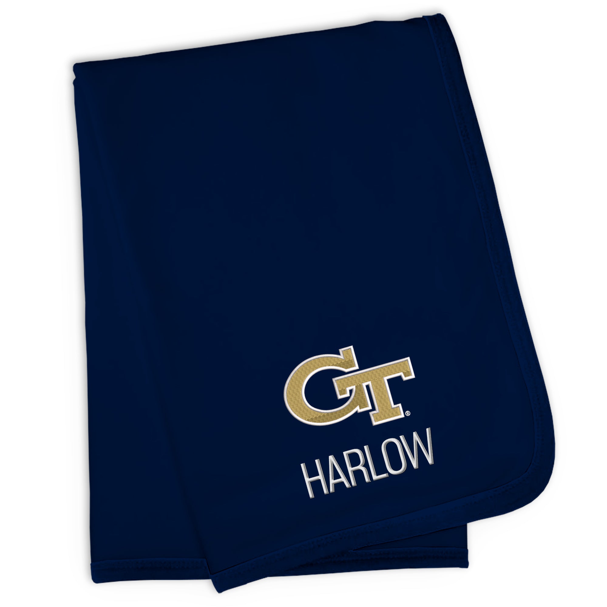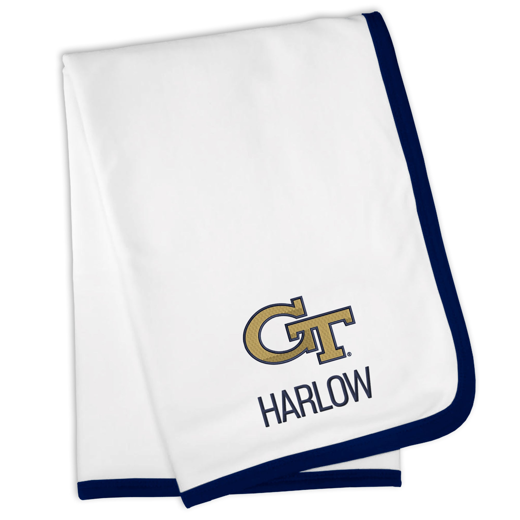 Our Personalized Georgia Tech Yellow Jackets Blanket is sized just right for a baby baseball fan. Constructed from super soft 100% cotton jersey knit and trimmed in Yellow Jackets team colors, this blanket is perfect for walks in the stroller or swaddling at bedtime.  Each blanket is embroidered with the official Yellow Jackets Blanket logo and your little one’s name or nickname.