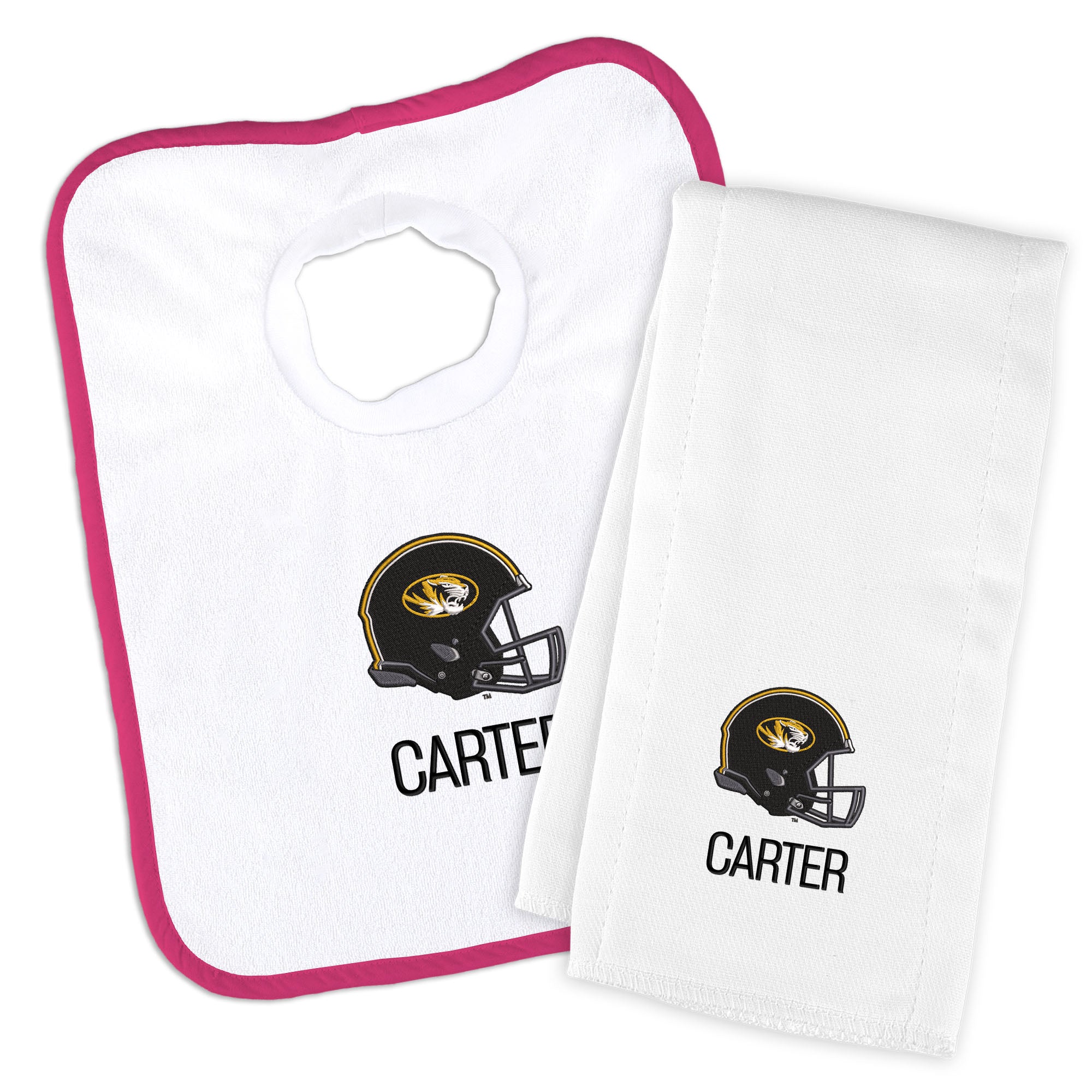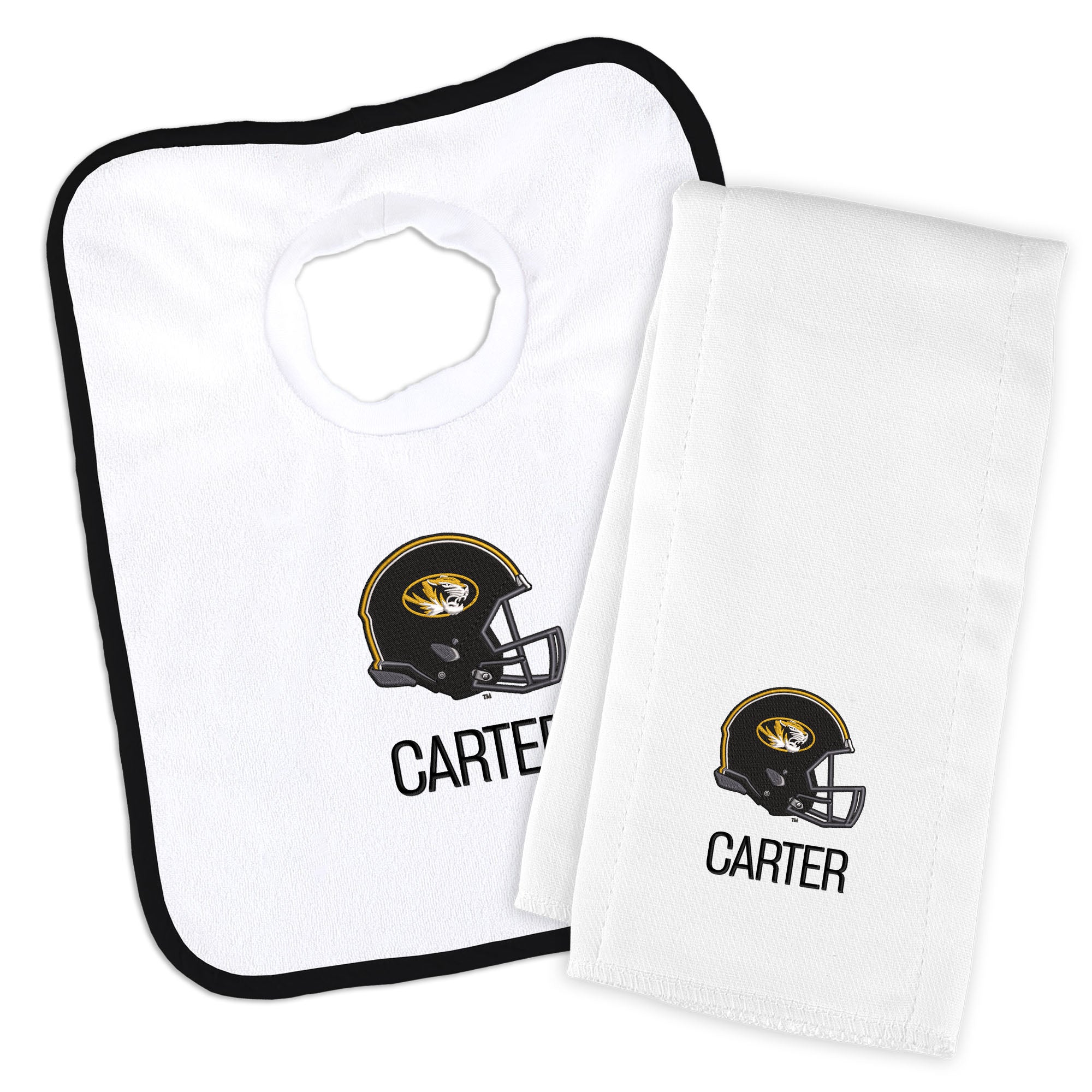 Get your little Tiger geared up in style with our Personalized Missouri Tigers Baby Bib and Burp Cloth Set. This set is the ultimate game day essential for your little fan! The pullover-style bib, crafted from stretch terry cloth, ensures a snug fit with its stretchable neck hole, while the burp cloth, made from 100% cotton, offers optimal absorption. Both items are officially licensed, featuring the iconic Tigers logo, making them the perfect addition to your baby's fan gear collection. Personalize the set with your baby's name for an extra special touch. Whether it's game day or everyday use, this set combines comfort, functionality, and team spirit seamlessly. Order the Personalized Missouri Tigers Baby Bib and Burp Cloth Set today and let your little one flaunt their team pride in style!