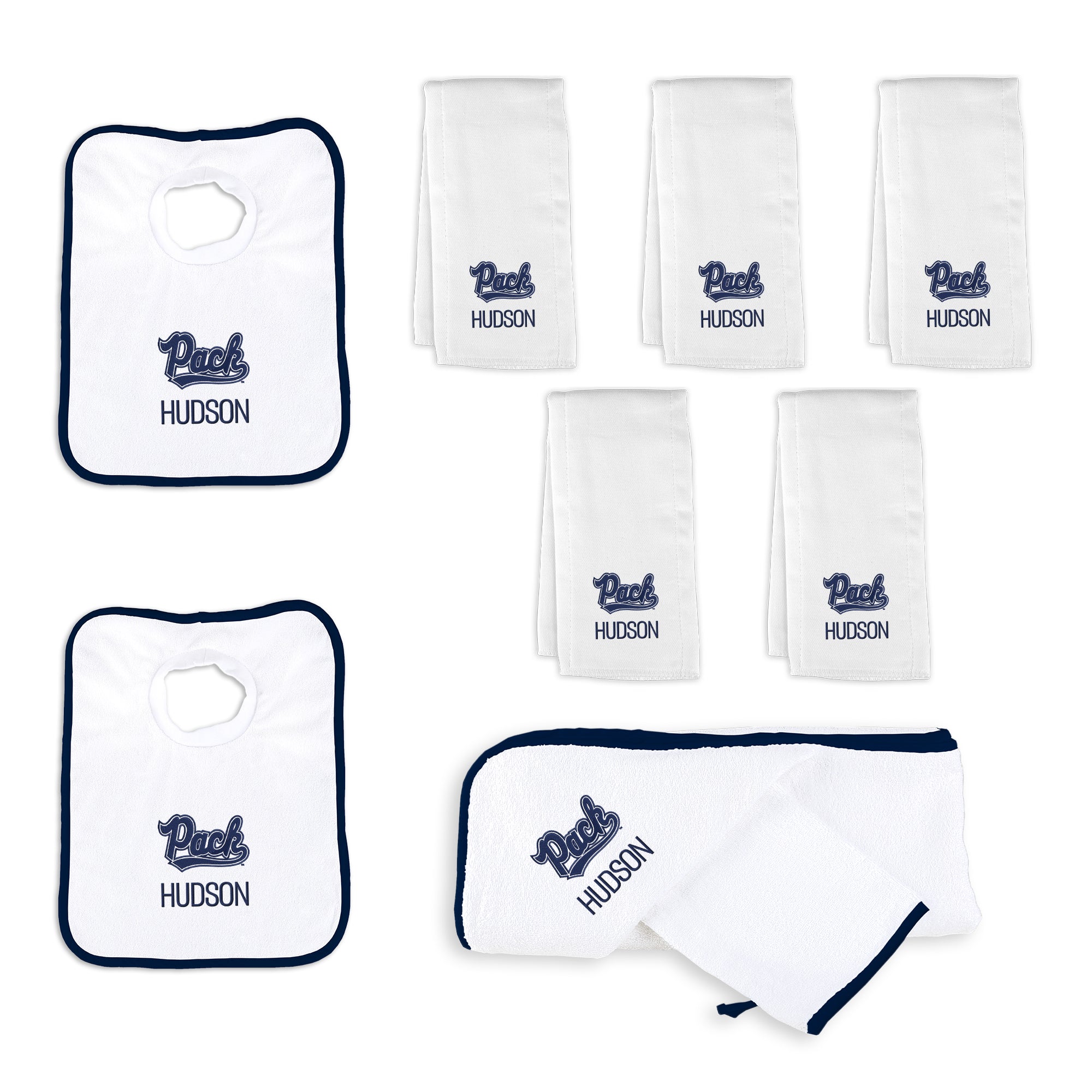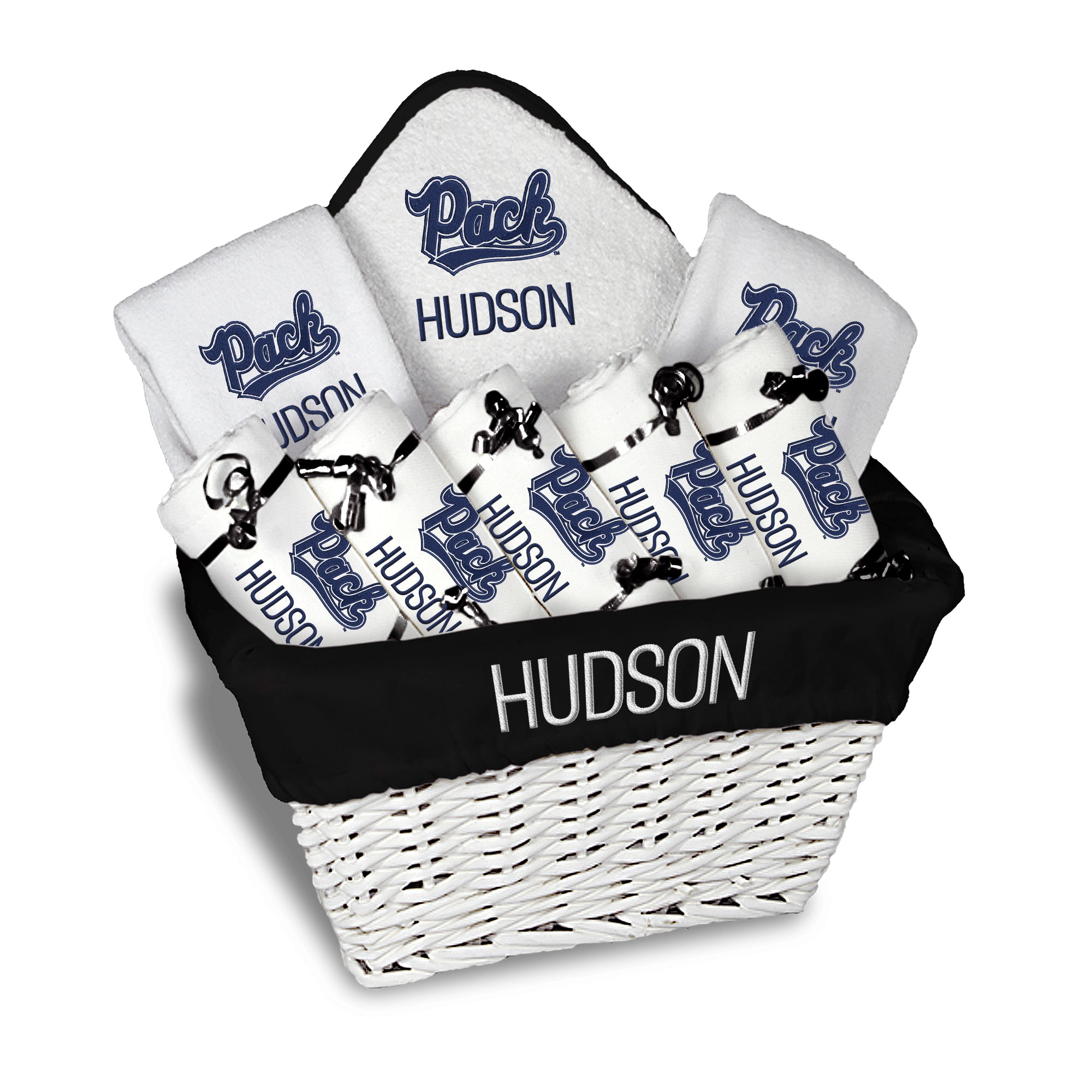 Our Personalized Nevada Wolf Pack Large Gift Basket contains an assortment of our best-selling items packaged in a white willow basket with a personalized cotton liner.  Each basket holds five of our 100% cotton burp cloths, two 100% cotton terry pullover bibs, and one 100% cotton terry hooded towel and wash mitt. The burp cloths, bibs and hooded towel are each embroidered with the Wolf Pack logo and baby’s name or nickname; the basket liner is embroidered with the baby’s name.