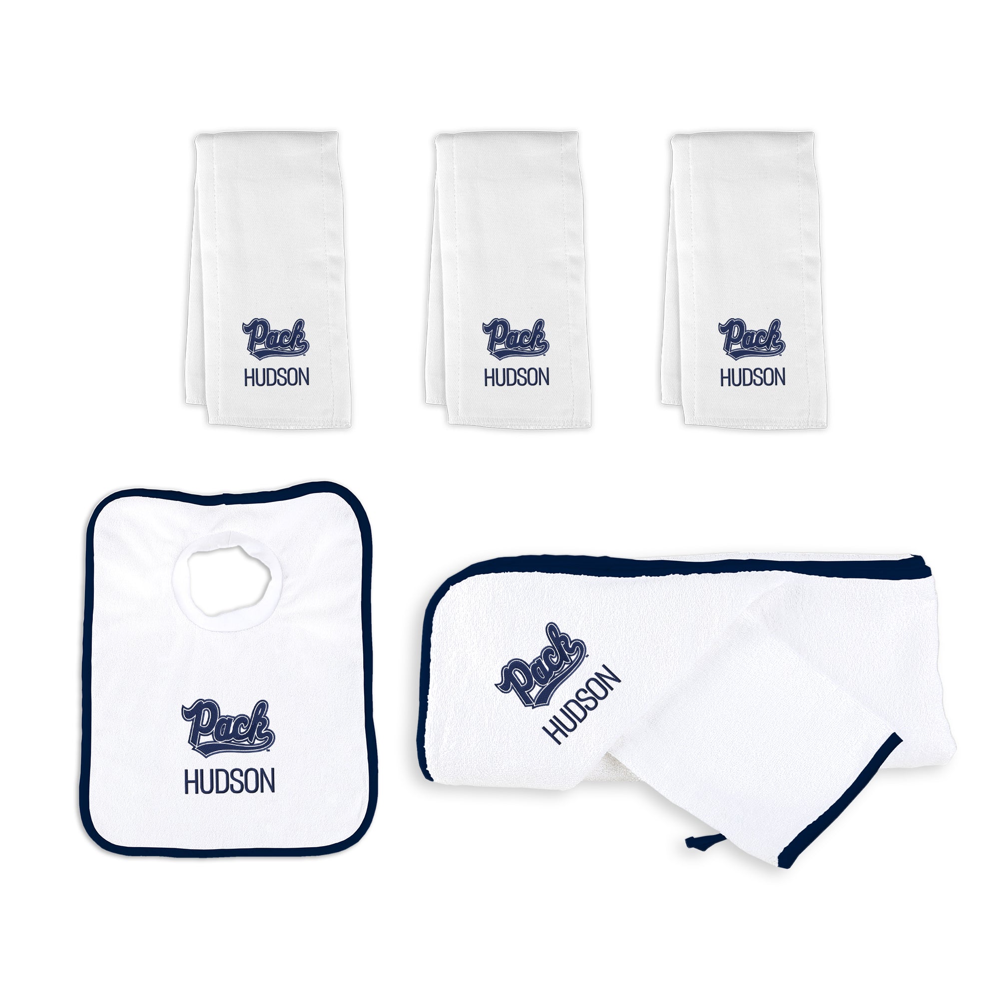 Our Personalized Nevada Wolf Pack Medium Gift Basket contains an assortment of our best-selling items packaged in a white willow basket with a personalized cotton liner. Each basket holds 3 of our 100% cotton burp cloths, one 100% cotton terry pullover bib, and one 100% cotton terry hooded towel and wash mitt. The burp cloths, bib and hooded towel are each embroidered with the Wolf Pack logo and baby’s name or nickname; the basket liner is embroidered with the baby’s name.