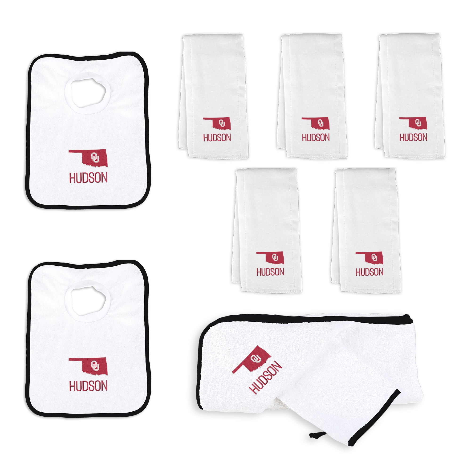 Our Personalized Oklahoma Sooners Large Gift Basket contains an assortment of our best-selling items packaged in a white willow basket with a personalized cotton liner.  Each basket holds five of our 100% cotton burp cloths, two 100% cotton terry pullover bibs, and one 100% cotton terry hooded towel and wash mitt. The burp cloths, bibs and hooded towel are each embroidered with the Sooners logo and baby’s name or nickname; the basket liner is embroidered with the baby’s name.