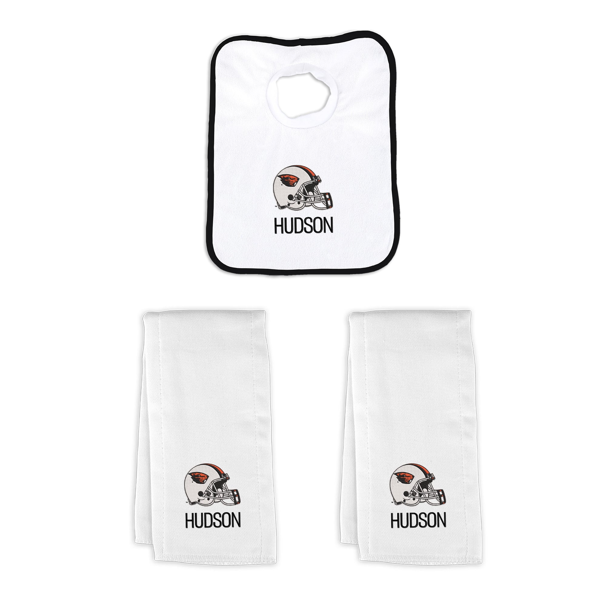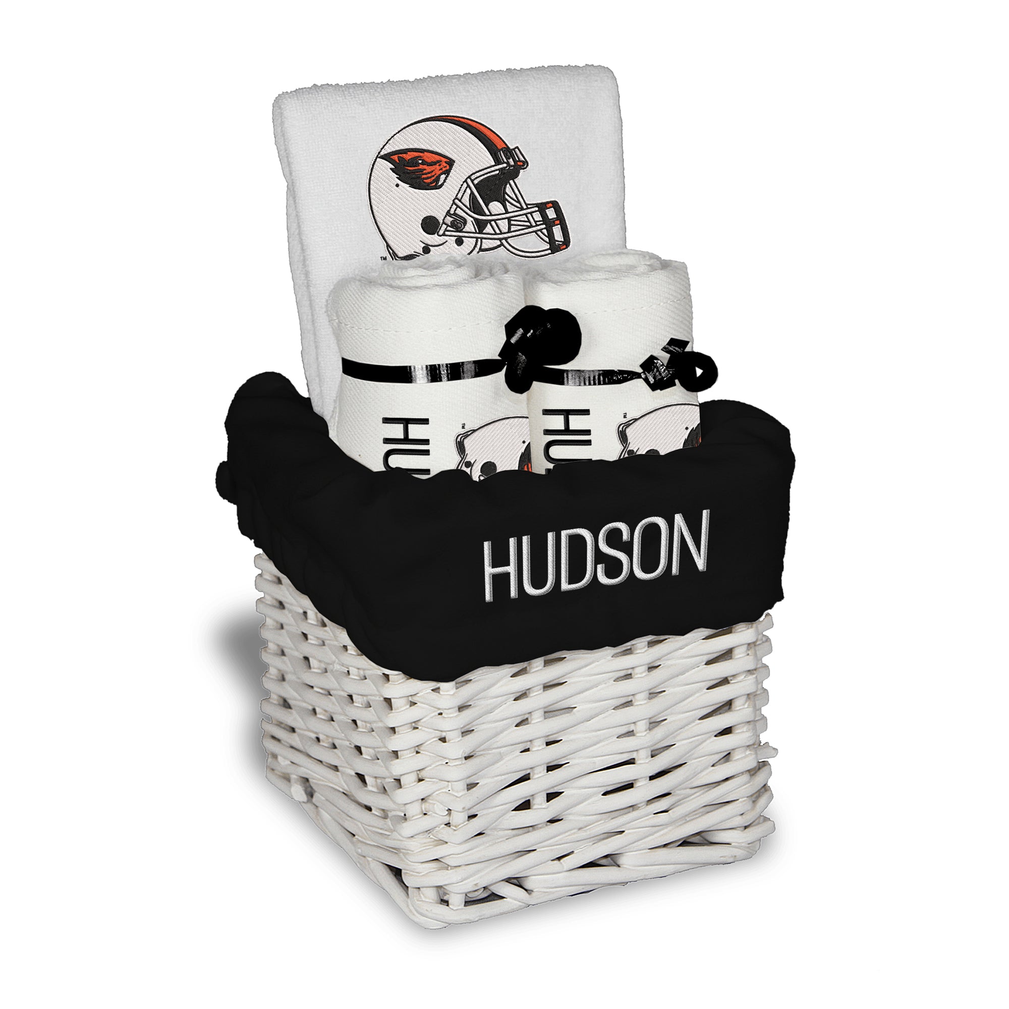 Our Personalized Oregon State Beavers Small Gift Basket contains 3 of our best-selling items packaged in a white willow basket with a personalized cotton liner.  Each basket holds 2 of our 100% cotton burp cloths and a 100% cotton terry pullover bib. each piece is embroidered with the official Beavers logo and baby's name or nickname.