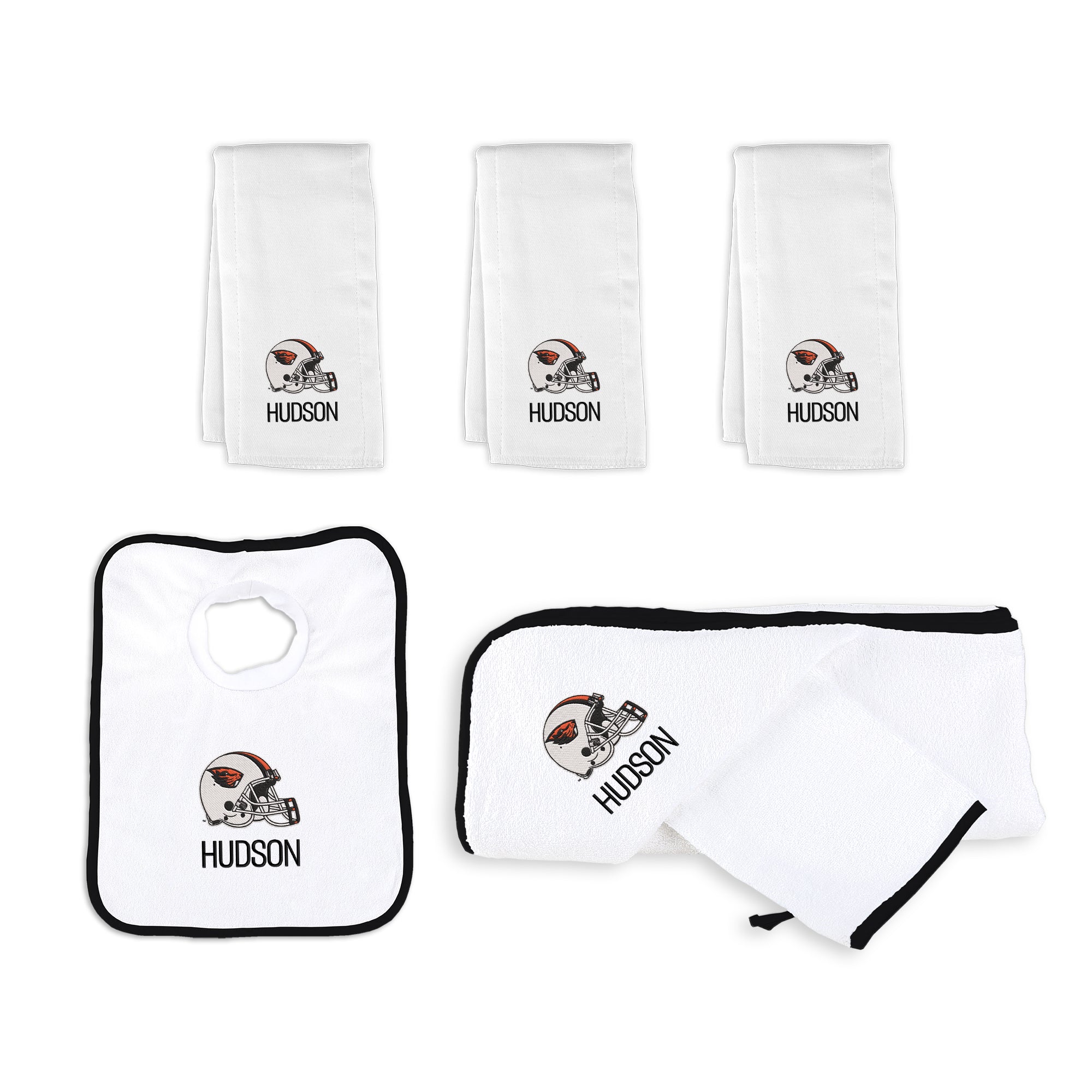 Our Personalized Oregon State Beavers Small Gift Basket contains 3 of our best-selling items packaged in a white willow basket with a personalized cotton liner. Each basket holds 2 of our 100% cotton burp cloths and a 100% cotton terry pullover bib. each piece is embroidered with the official Beavers logo and baby's name or nickname.