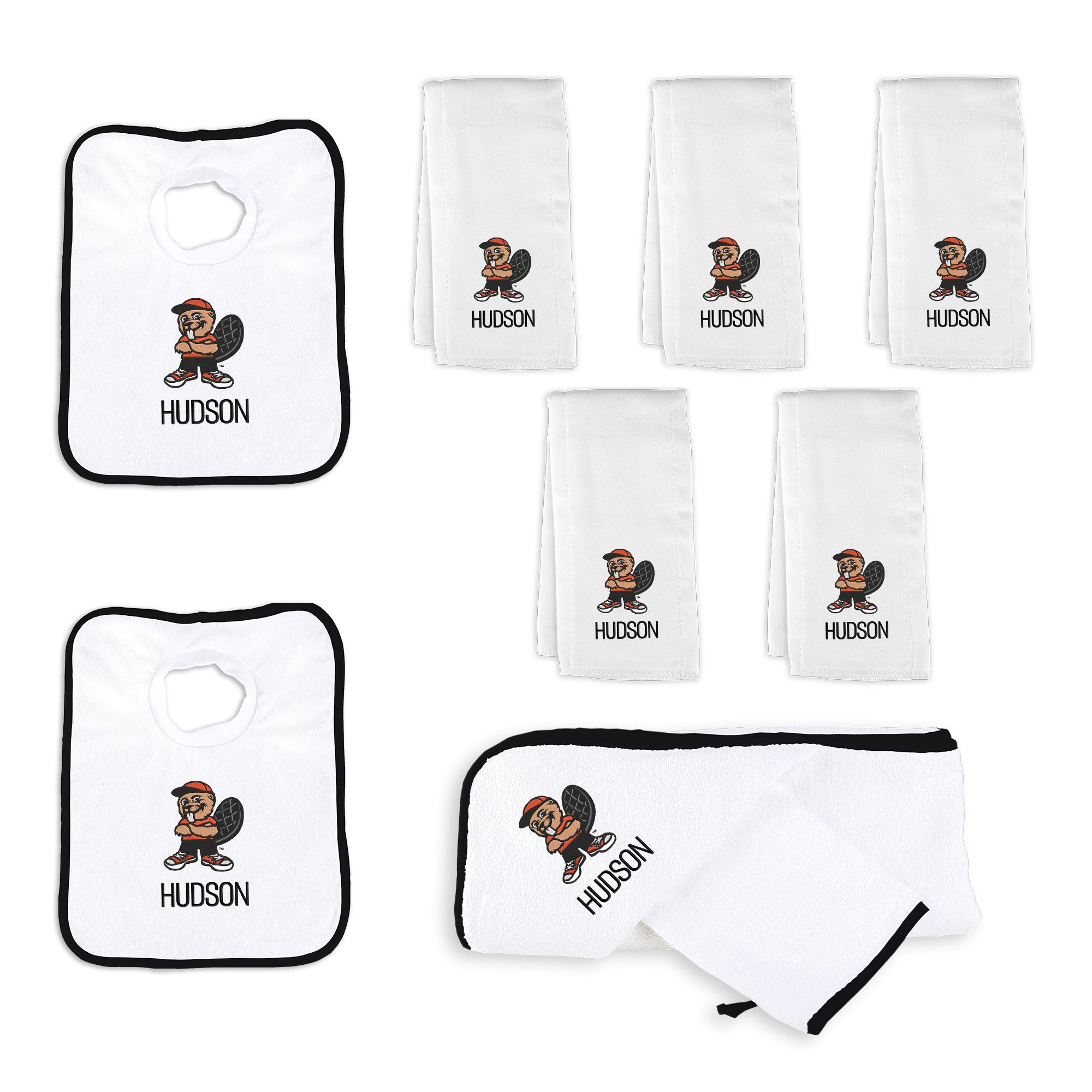 Our Personalized Oregon State Beavers Large Gift Basket contains an assortment of our best-selling items packaged in a white willow basket with a personalized cotton liner. Each basket holds five of our 100% cotton burp cloths, two 100% cotton terry pullover bibs, and one 100% cotton terry hooded towel and wash mitt. The burp cloths, bibs and hooded towel are each embroidered with the Beavers logo and baby’s name or nickname; the basket liner is embroidered with the baby’s name.