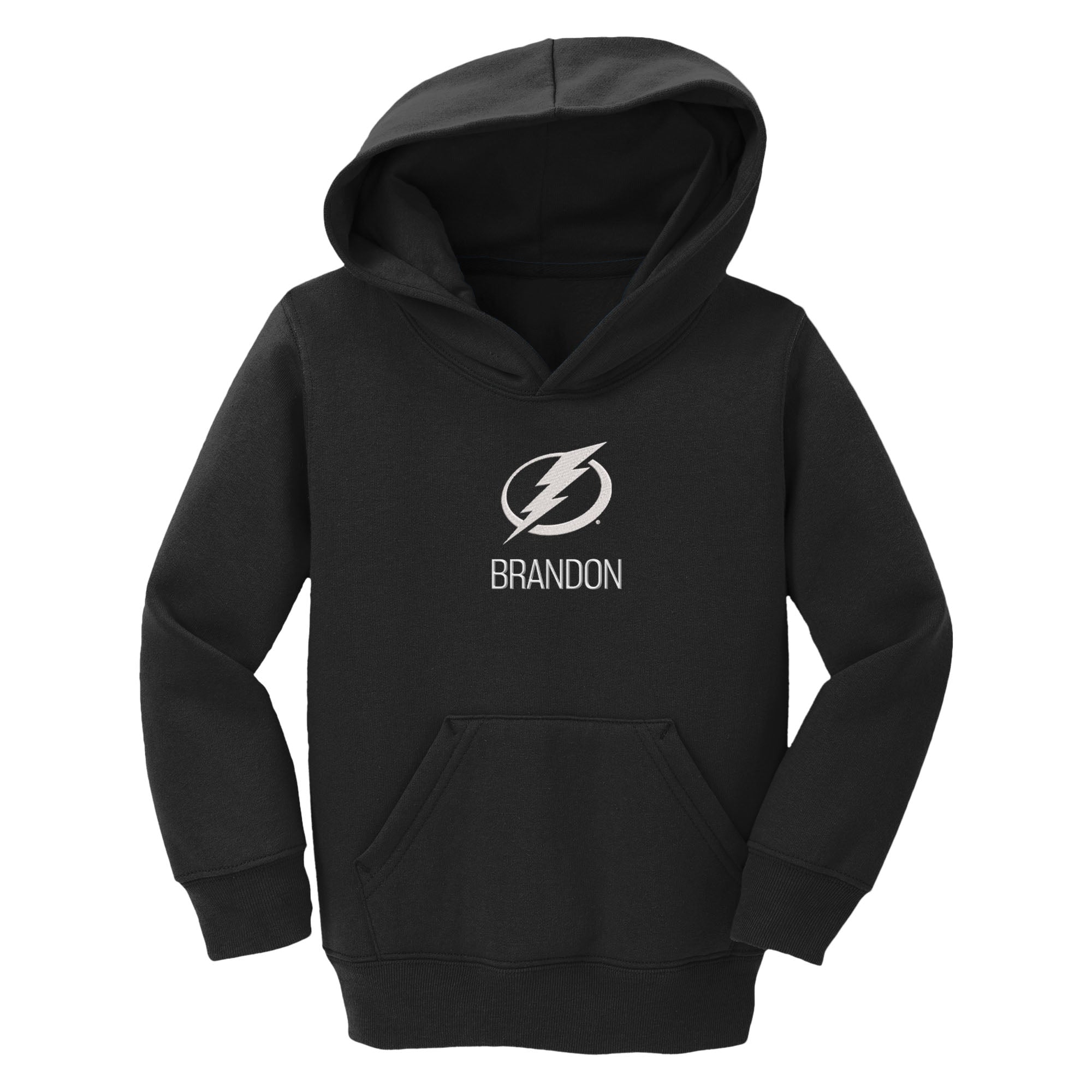 The hoodie features an embroidered Tampa Bay Lightning team logo prominently displayed on the front, showcasing your child's support for the team. What sets this hoodie apart is the option to personalize it with your child's name or a special phrase, embroidered underneath the team logo, making it a unique and cherished item for your little one.