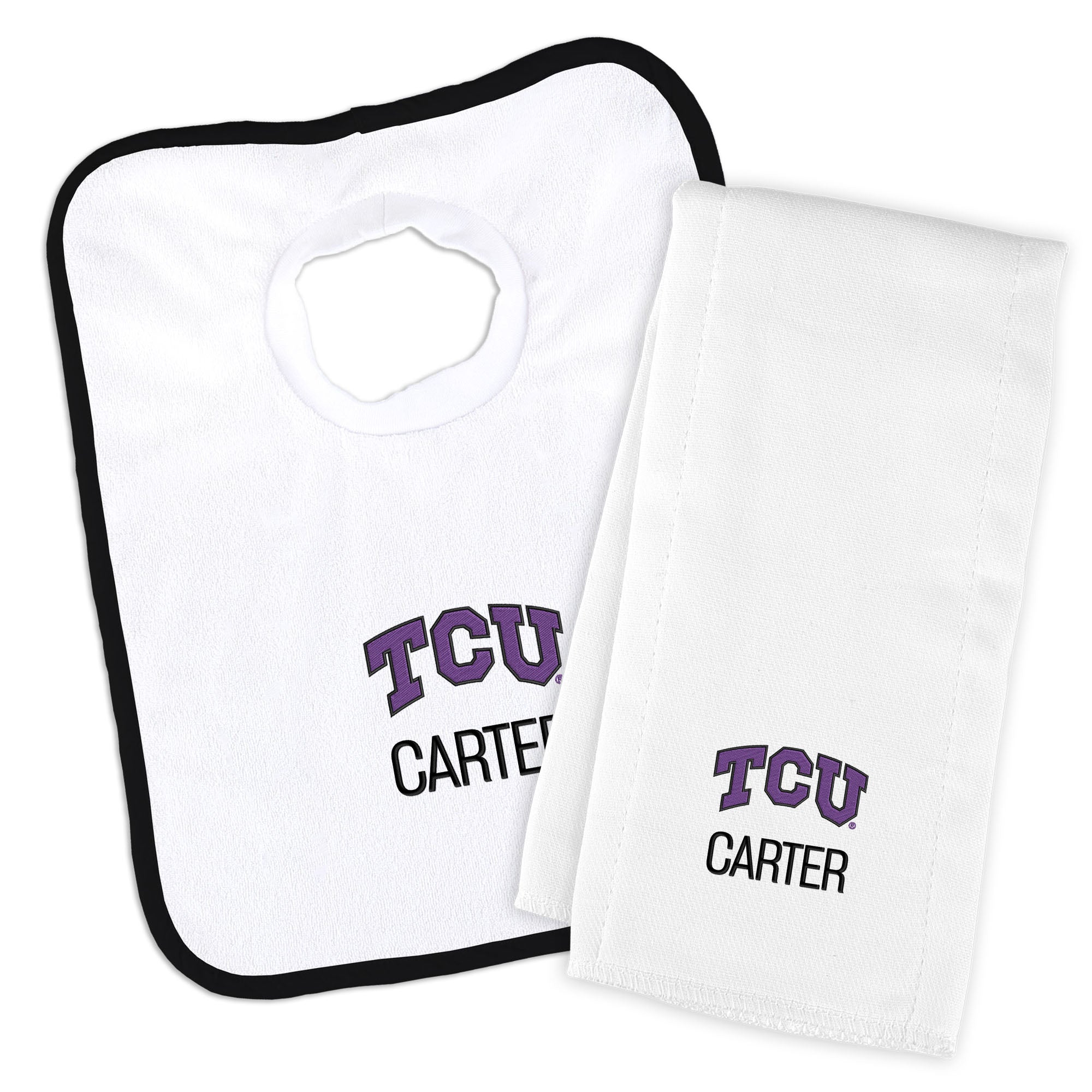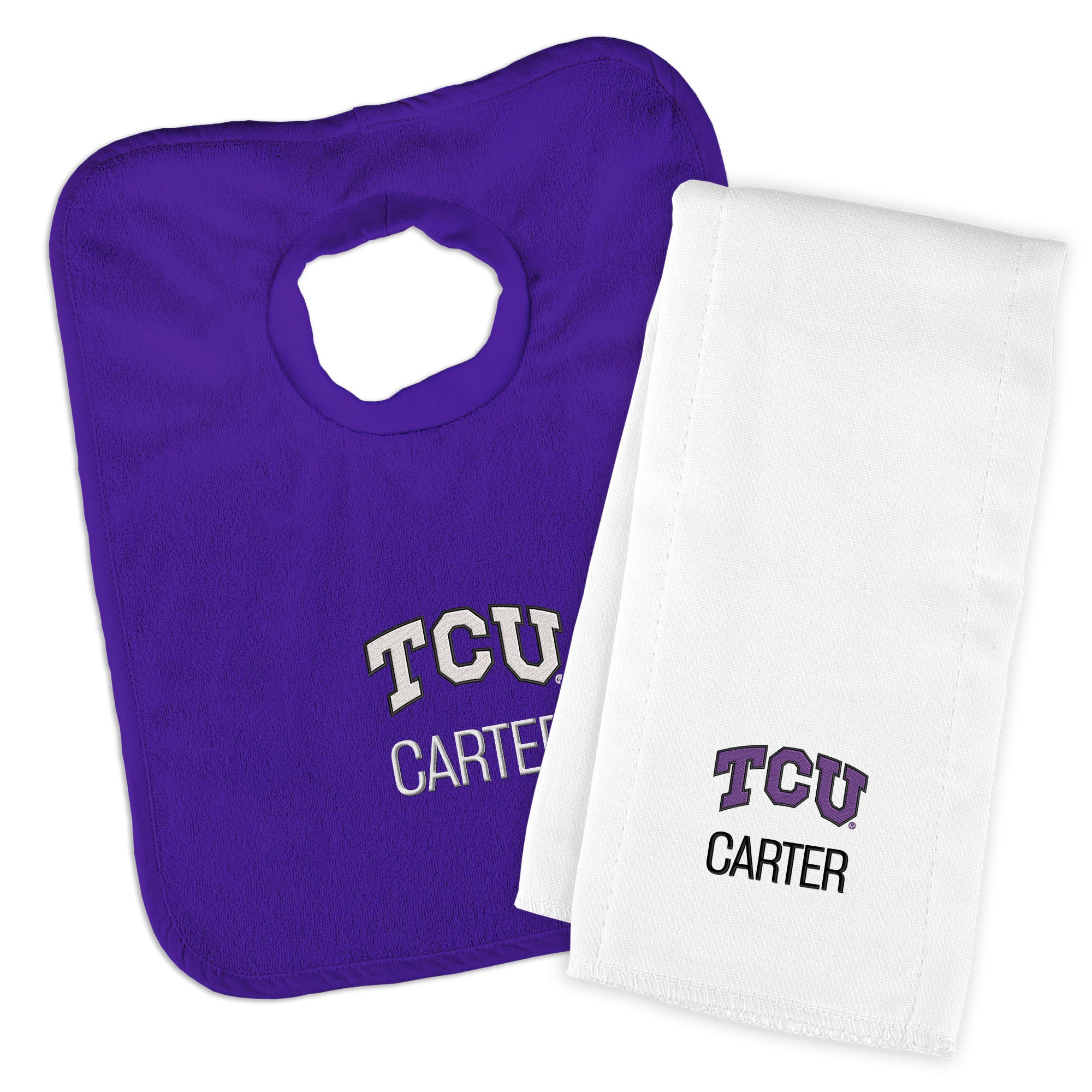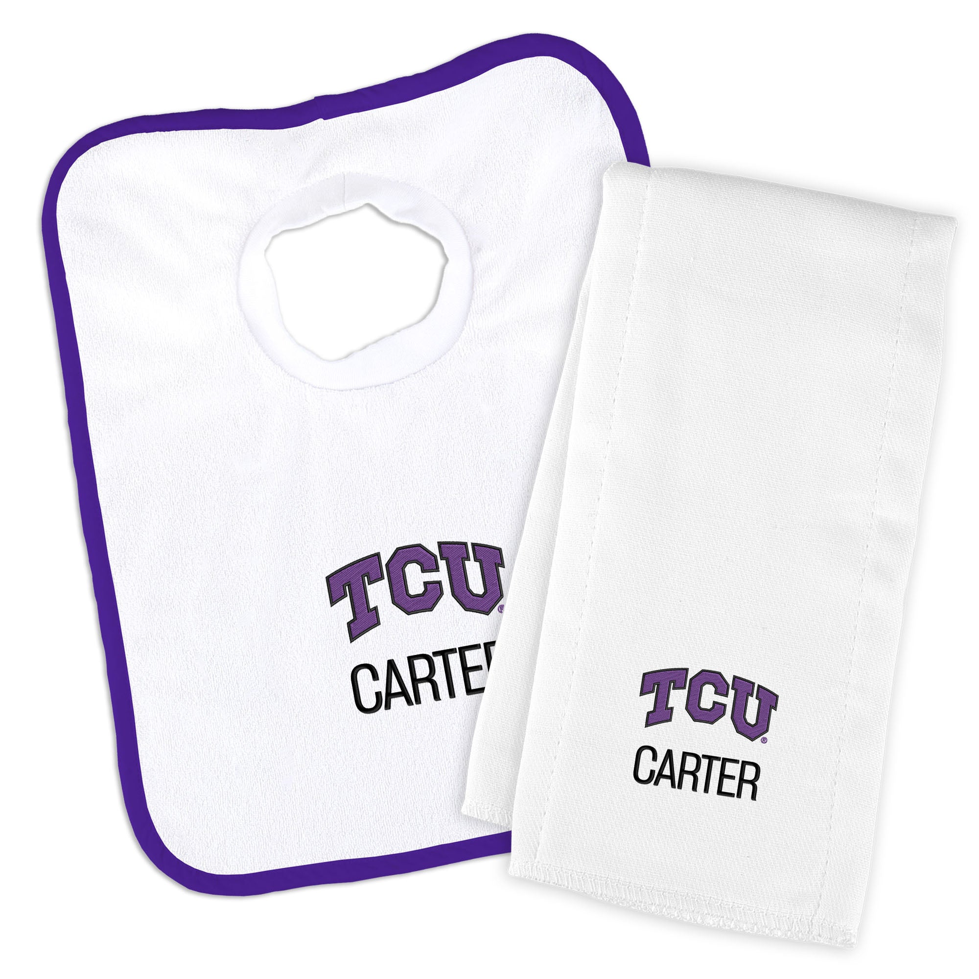 Get your little Horned Frog geared up in style with our Personalized TCU Horned Frogs Baby Bib and Burp Cloth Set. This set is the ultimate game day essential for your little fan! The pullover-style bib, crafted from stretch terry cloth, ensures a snug fit with its stretchable neck hole, while the burp cloth, made from 100% cotton, offers optimal absorption. Both items are officially licensed, featuring the iconic Horned Frog logo, making them the perfect addition to your baby's fan gear collection. Personalize the set with your baby's name for an extra special touch. Whether it's game day or everyday use, this set combines comfort, functionality, and team spirit seamlessly. Order the Personalized TCU Horned Frogs Baby Bib and Burp Cloth Set today and let your little one flaunt their team pride in style!
