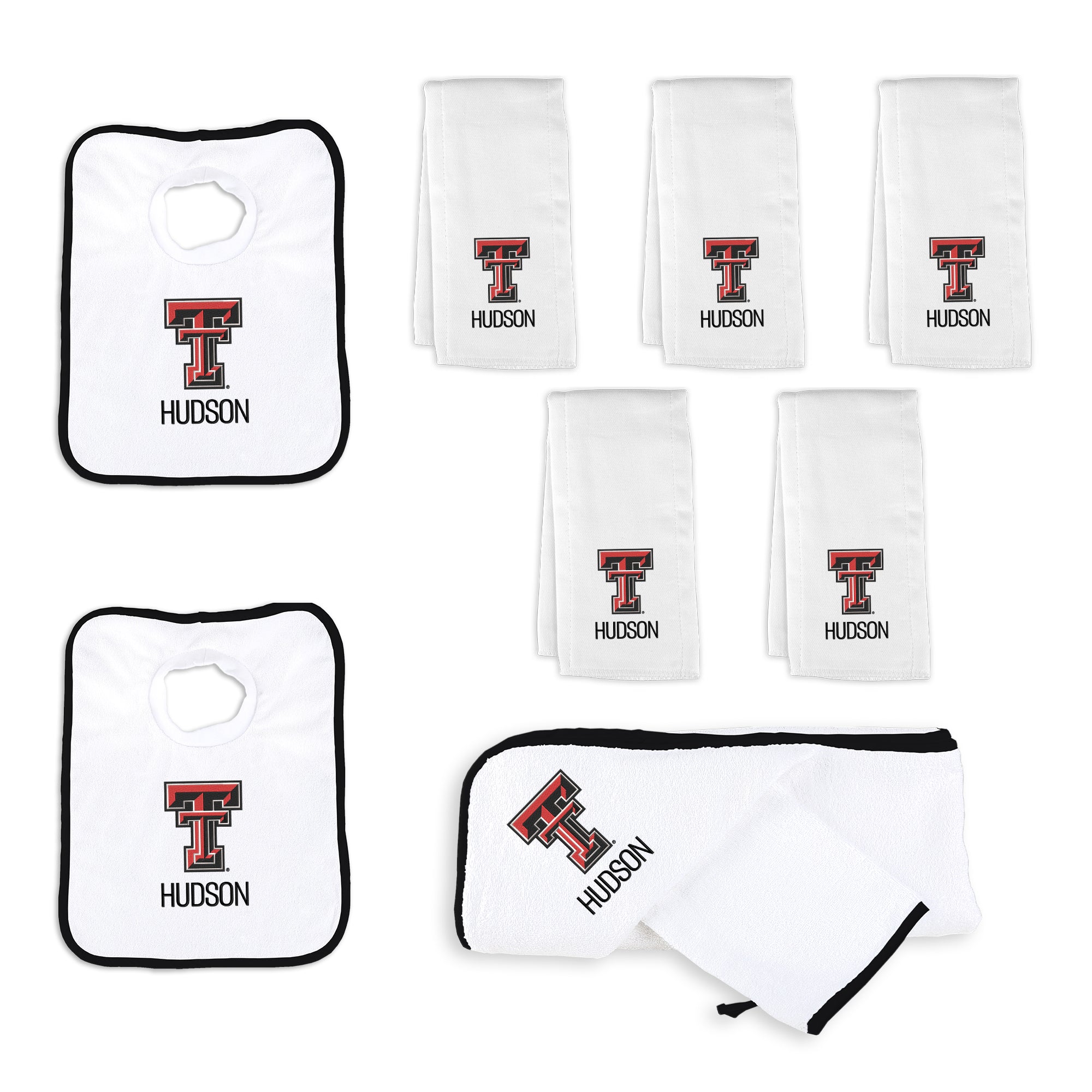 Our Personalized Texas Tech Red Raiders Large Gift Basket contains an assortment of our best-selling items packaged in a white willow basket with a personalized cotton liner. Each basket holds five of our 100% cotton burp cloths, two 100% cotton terry pullover bibs, and one 100% cotton terry hooded towel and wash mitt. The burp cloths, bibs and hooded towel are each embroidered with the Red Raiders logo and baby’s name or nickname; the basket liner is embroidered with the baby’s name.