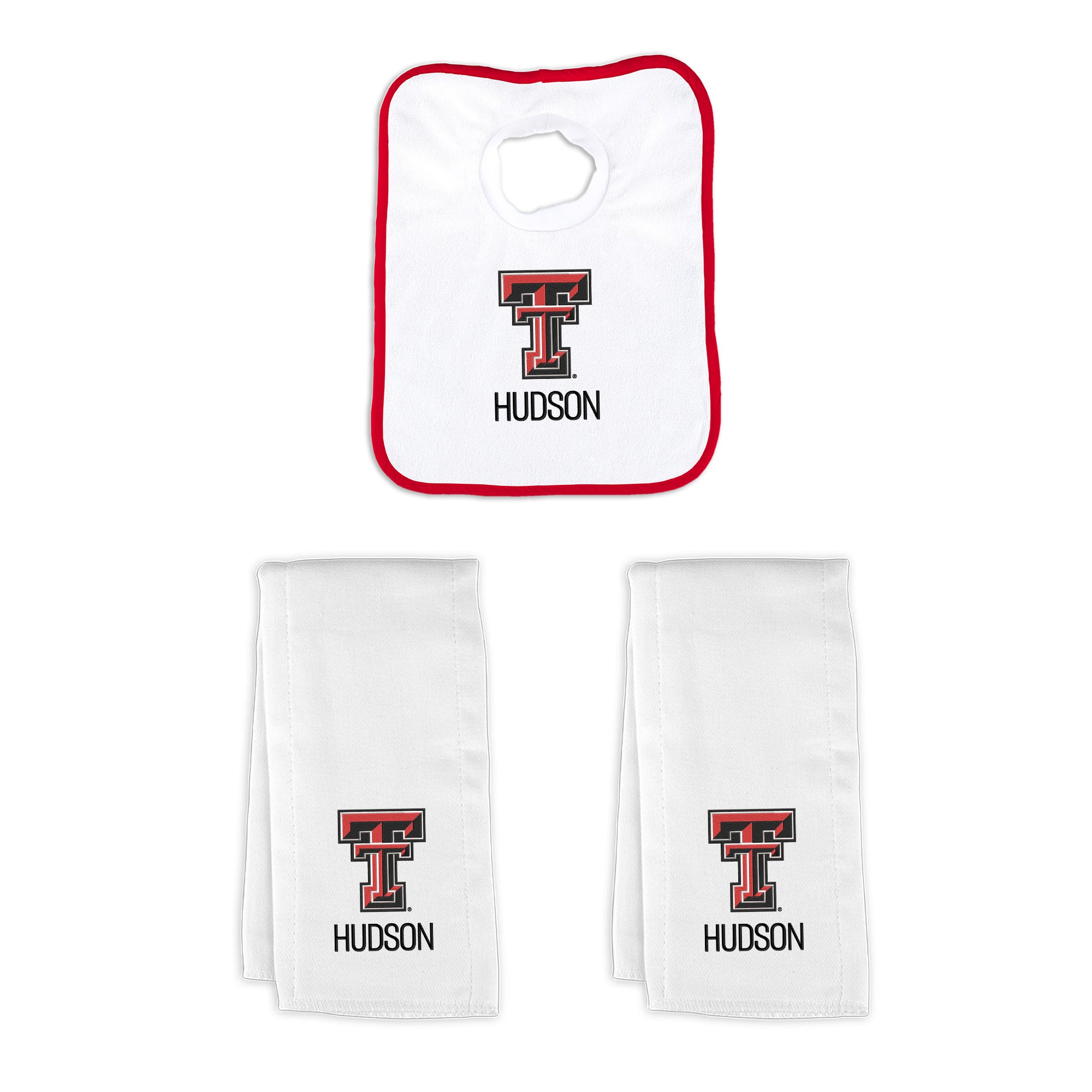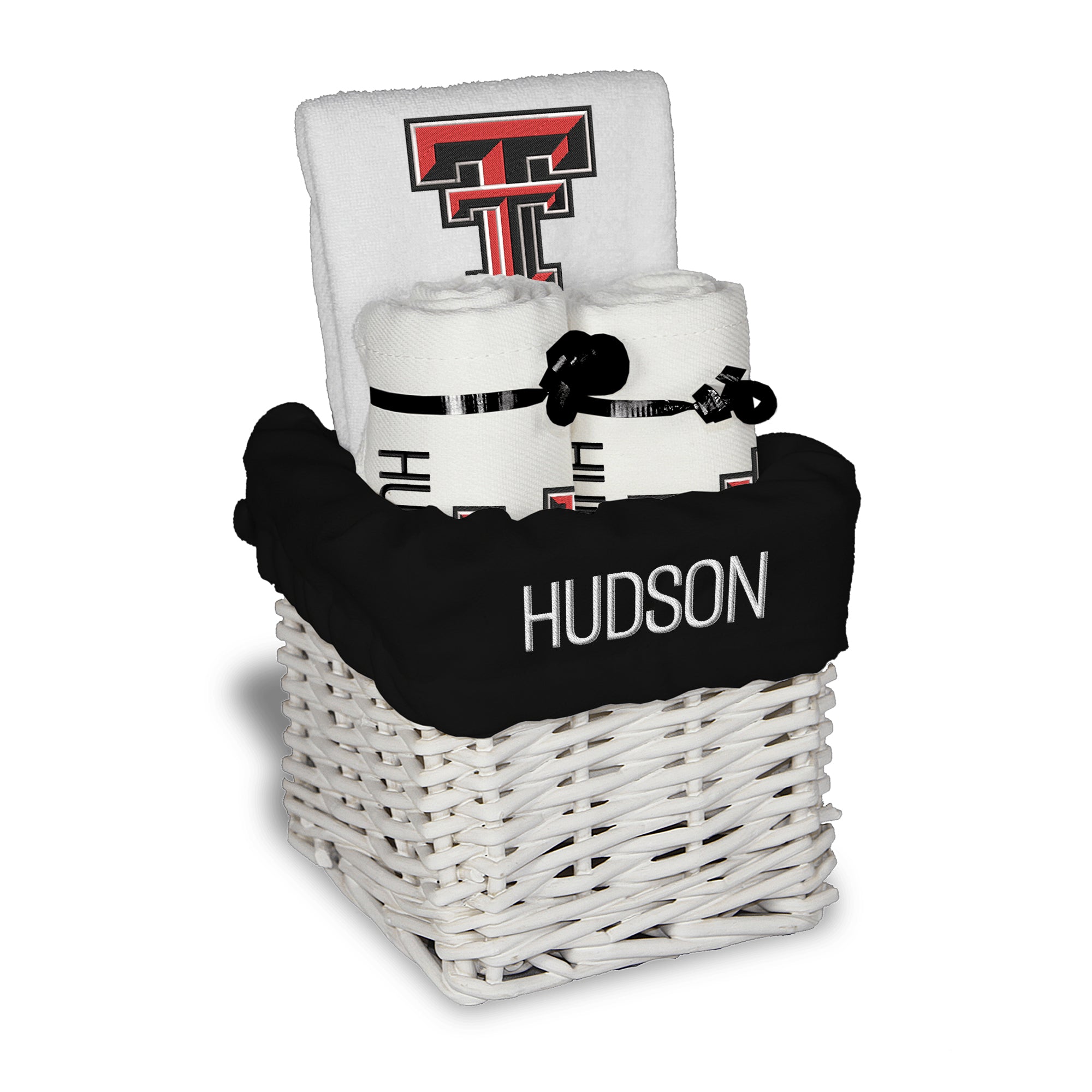 Our Personalized Texas Tech Red Raiders Small Gift Basket contains 3 of our best-selling items packaged in a white willow basket with a personalized cotton liner.  Each basket holds 2 of our 100% cotton burp cloths and a 100% cotton terry pullover bib. each piece is embroidered with the official Red Raiders logo and baby's name or nickname.