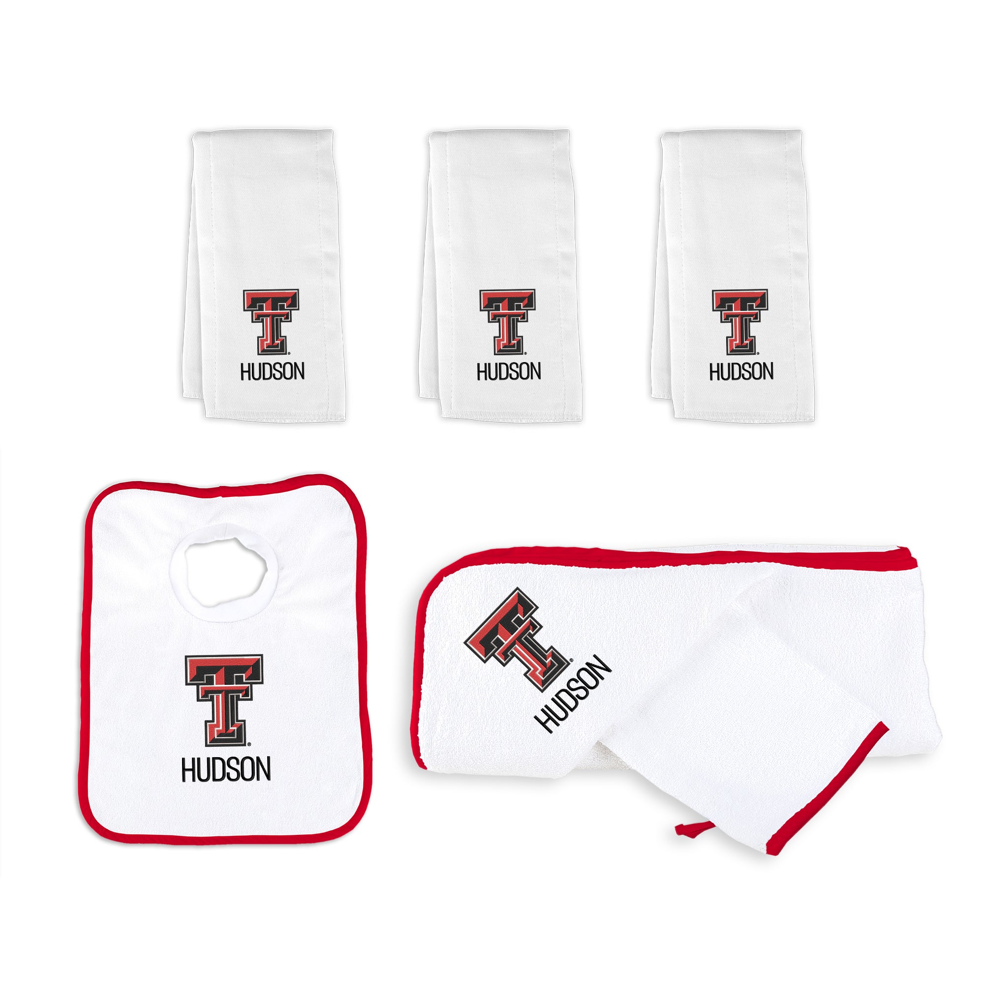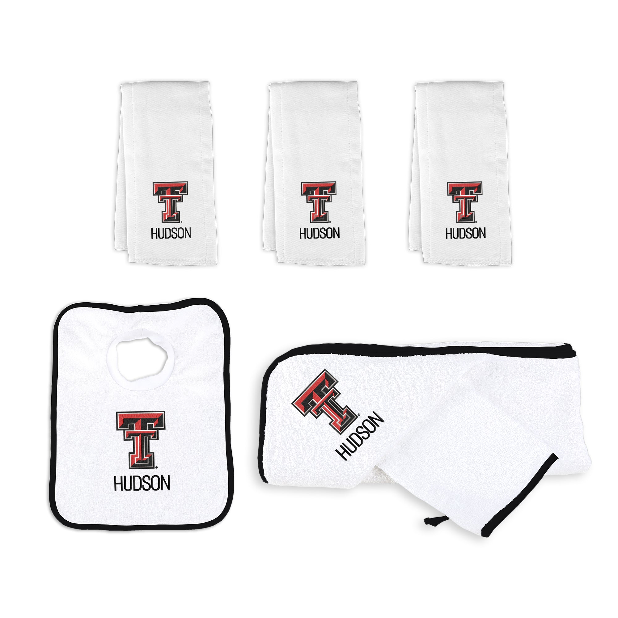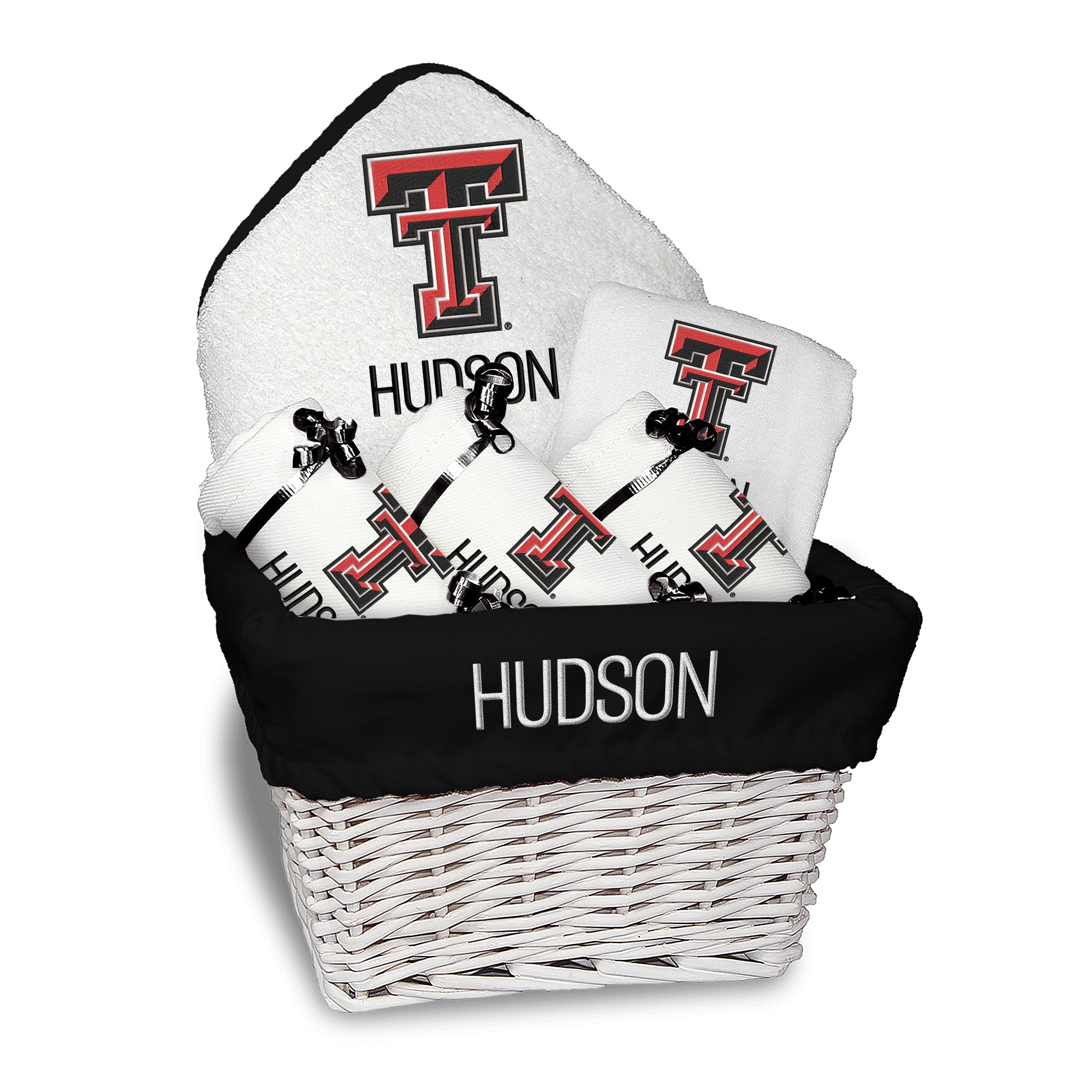 Our Personalized Texas Tech Red Raiders Small Gift Basket contains 3 of our best-selling items packaged in a white willow basket with a personalized cotton liner.  Each basket holds 2 of our 100% cotton burp cloths and a 100% cotton terry pullover bib. each piece is embroidered with the official Red Raiders logo and baby's name or nickname.