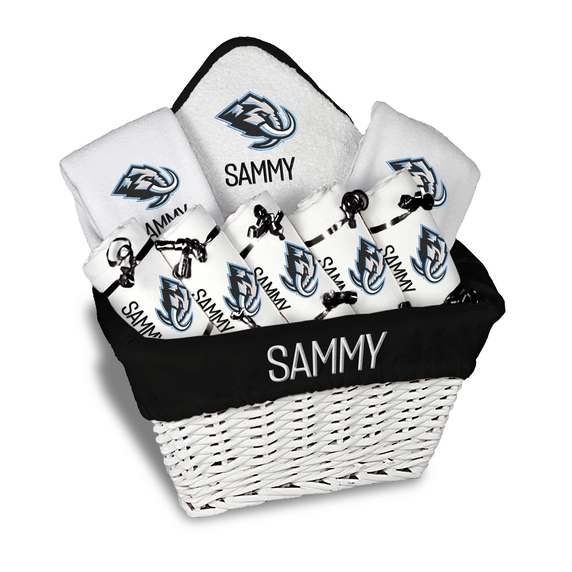 Our Personalized Utah Mammoth Large Gift Basket contains an assortment of our best-selling items packaged in a white willow basket with a personalized cotton liner. Each basket holds five of our 100% cotton burp cloths, two 100% cotton terry pullover bibs, and one 100% cotton terry hooded towel and wash mitt. The burp cloths, bibs and hooded towel are each embroidered with the Utah Mammoth logo and baby’s name or nickname; the basket liner is embroidered with the baby’s name.