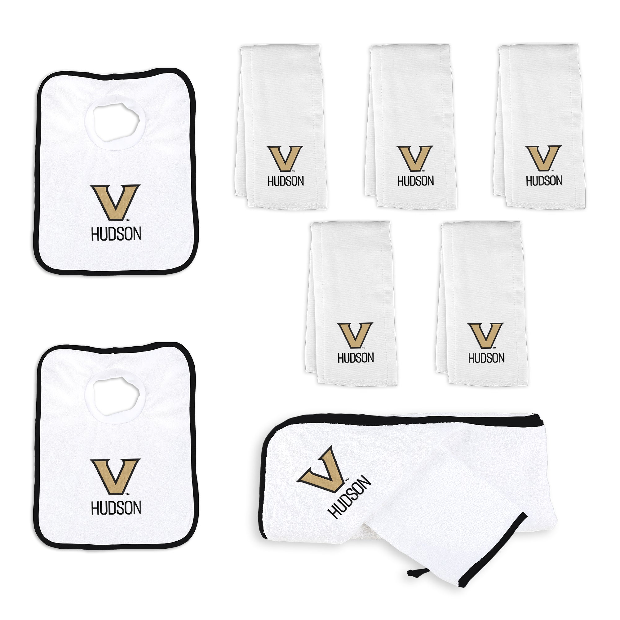 Our Personalized Vanderbilt Commodores Large Gift Basket contains an assortment of our best-selling items packaged in a white willow basket with a personalized cotton liner.  Each basket holds five of our 100% cotton burp cloths, two 100% cotton terry pullover bibs, and one 100% cotton terry hooded towel and wash mitt. The burp cloths, bibs and hooded towel are each embroidered with the Commodores logo and baby’s name or nickname; the basket liner is embroidered with the baby’s name.
