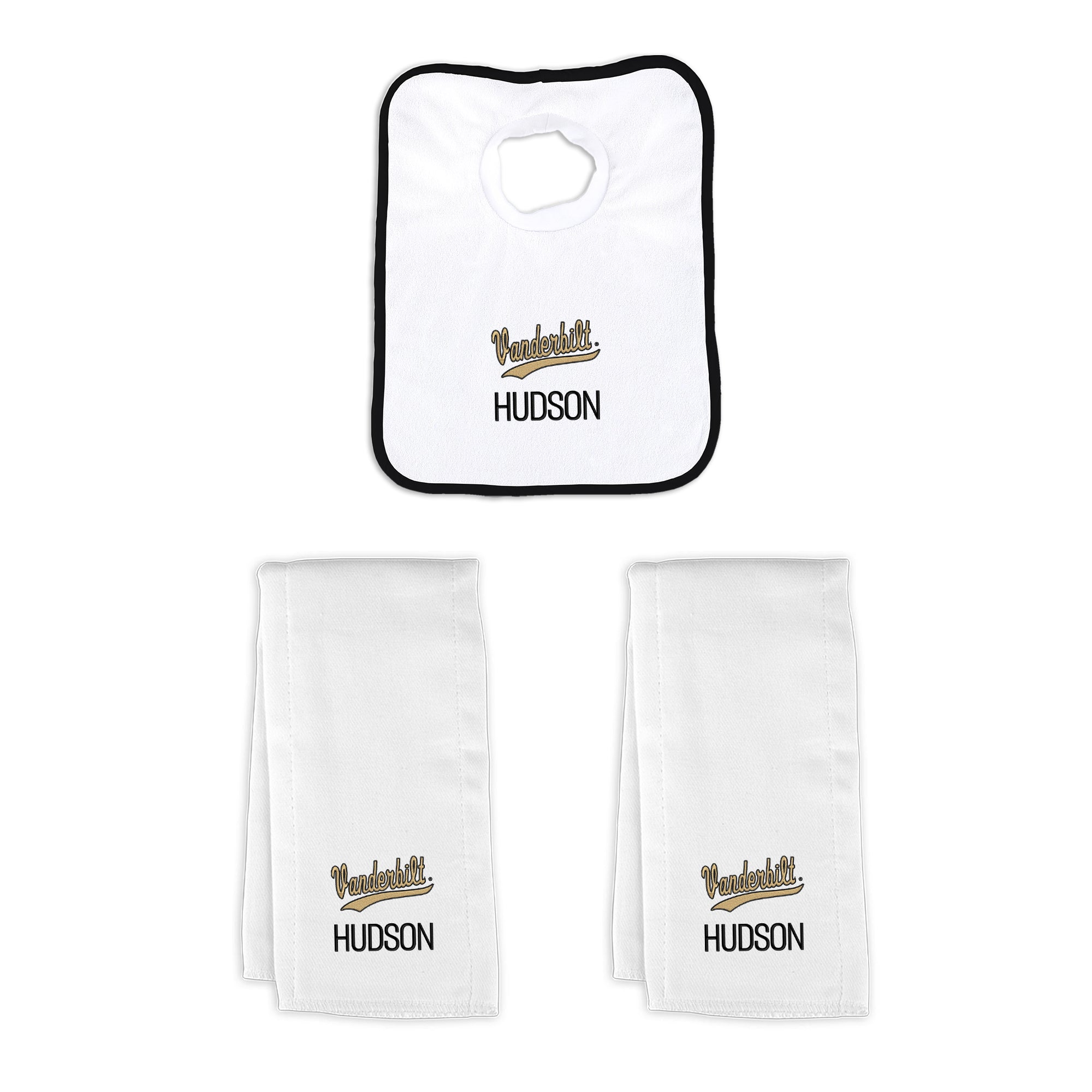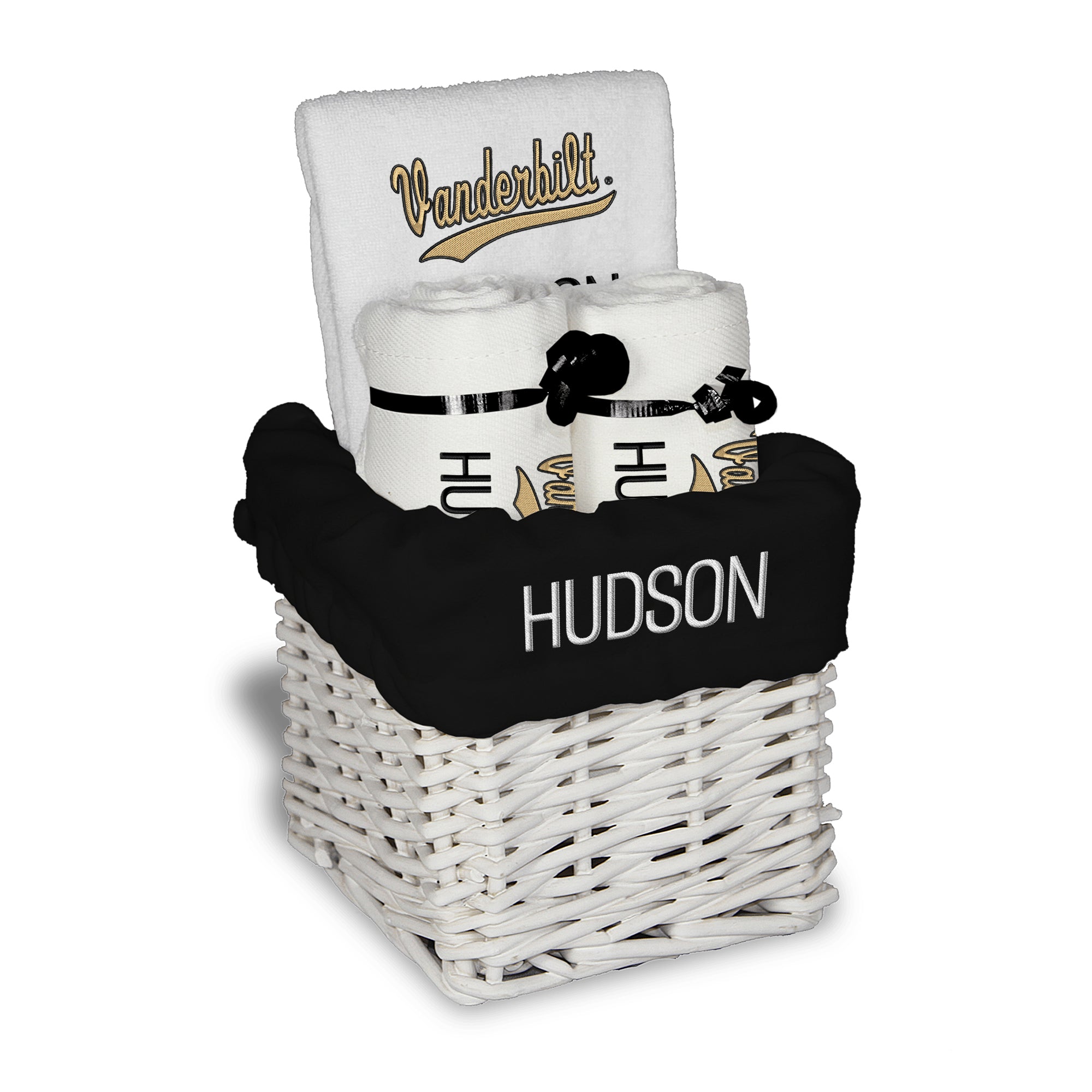 Our Personalized Vanderbilt Commodores Small Gift Basket contains 3 of our best-selling items packaged in a white willow basket with a personalized cotton liner.  Each basket holds 2 of our 100% cotton burp cloths and a 100% cotton terry pullover bib. each piece is embroidered with the official Commodores logo and baby's name or nickname.