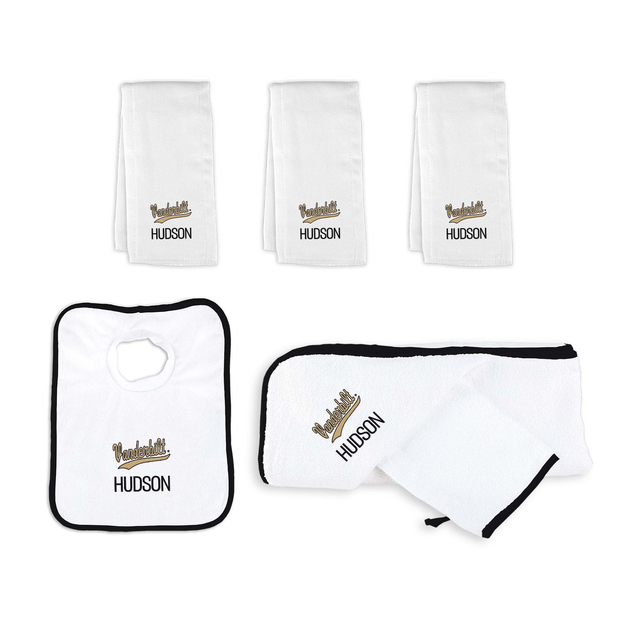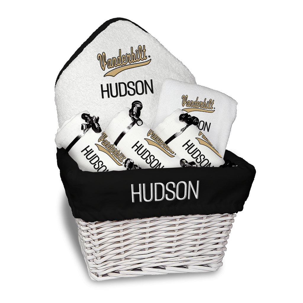 Our Personalized Vanderbilt Commodores Beavers Small Gift Basket contains 3 of our best-selling items packaged in a white willow basket with a personalized cotton liner. Each basket holds 2 of our 100% cotton burp cloths and a 100% cotton terry pullover bib. each piece is embroidered with the official Commodores logo and baby's name or nickname.
