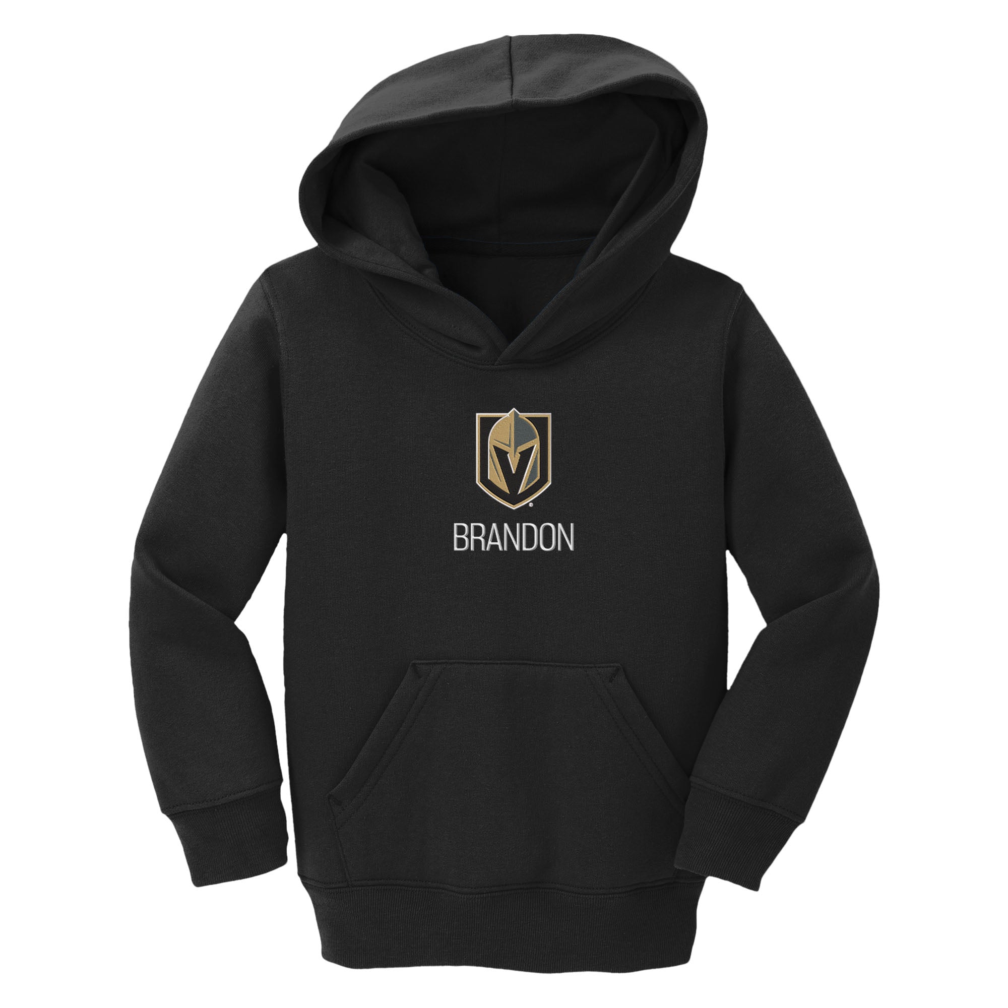 The hoodie features an embroidered Vegas Golden Knights team logo prominently displayed on the front, showcasing your child's support for the team. What sets this hoodie apart is the option to personalize it with your child's name or a special phrase, embroidered underneath the team logo, making it a unique and cherished item for your little one.