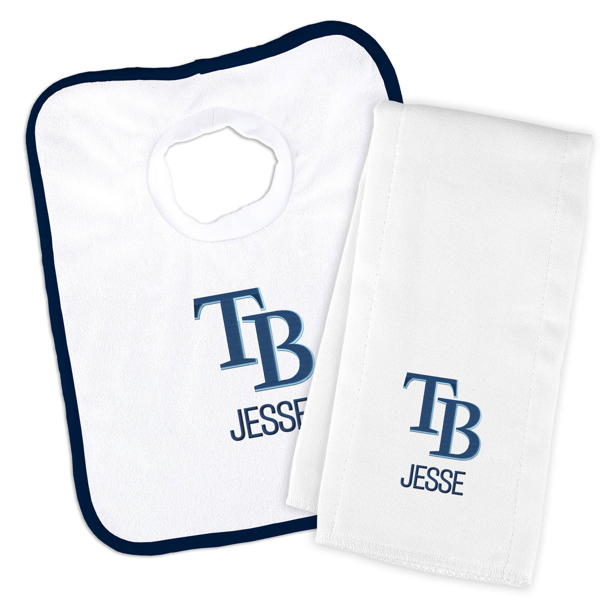 Our Personalized Tampa Bay Rays Bib and Burp Cloth Set is a thoughtful and useful gift for every baby Rays fan. The Rays burp cloth is generously sized and made of soft, absorbent 100% cotton, and the Rays bib has a soft, stretchable cotton neck hole for baby’s comfort. Parents, the bib slips easily over your baby's head and features a soft, gently gathered stretch cotton neck hole for maximum comfort; also, the burp cloth is a must-have asset.